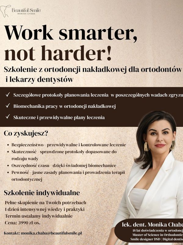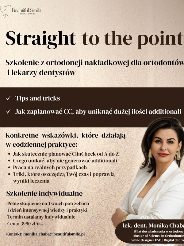 Monika Chaba wierzy, że technologia to przyszłość ortodoncji, a dobrze zaplanowane leczenie to klucz do sukcesu. Jeśli chcesz podnieść swoje kwalifikacje i przenieść swoją praktykę ortodontyczną na wyższy poziom, dołącz do jej programu szkoleniowego i odkryj możliwości cyfrowej transformacji w leczeniu ortodontycznym.